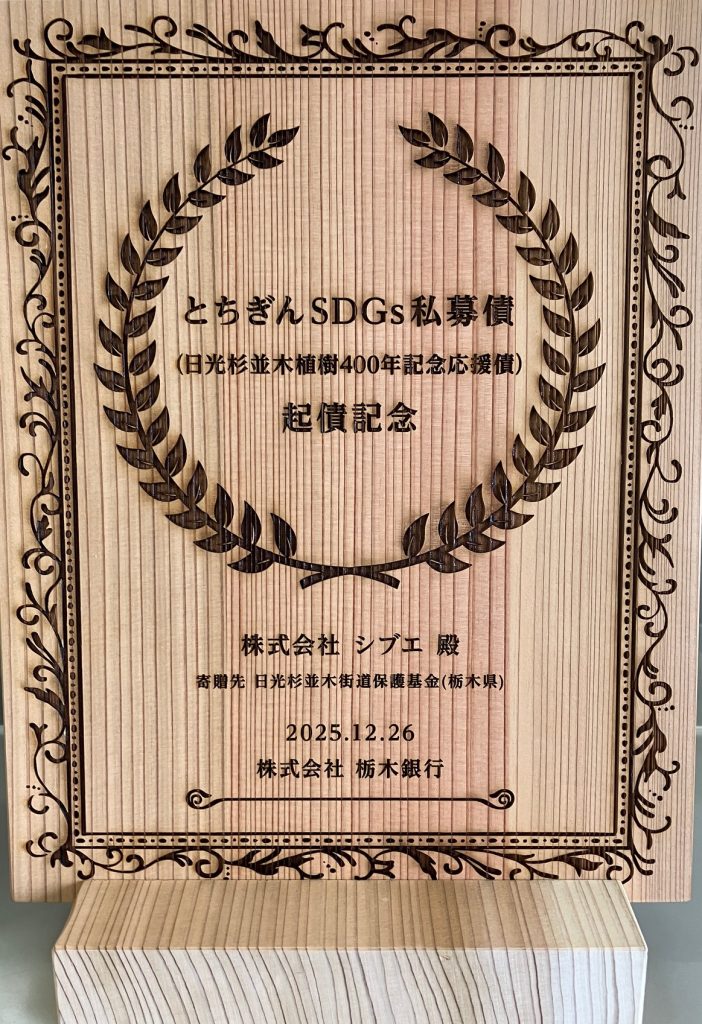 今回、本趣旨に賛同させて頂き、栃木銀行様よ栃木県様の「日光杉並木街道保護基金」へ寄付を行わせて頂きました。